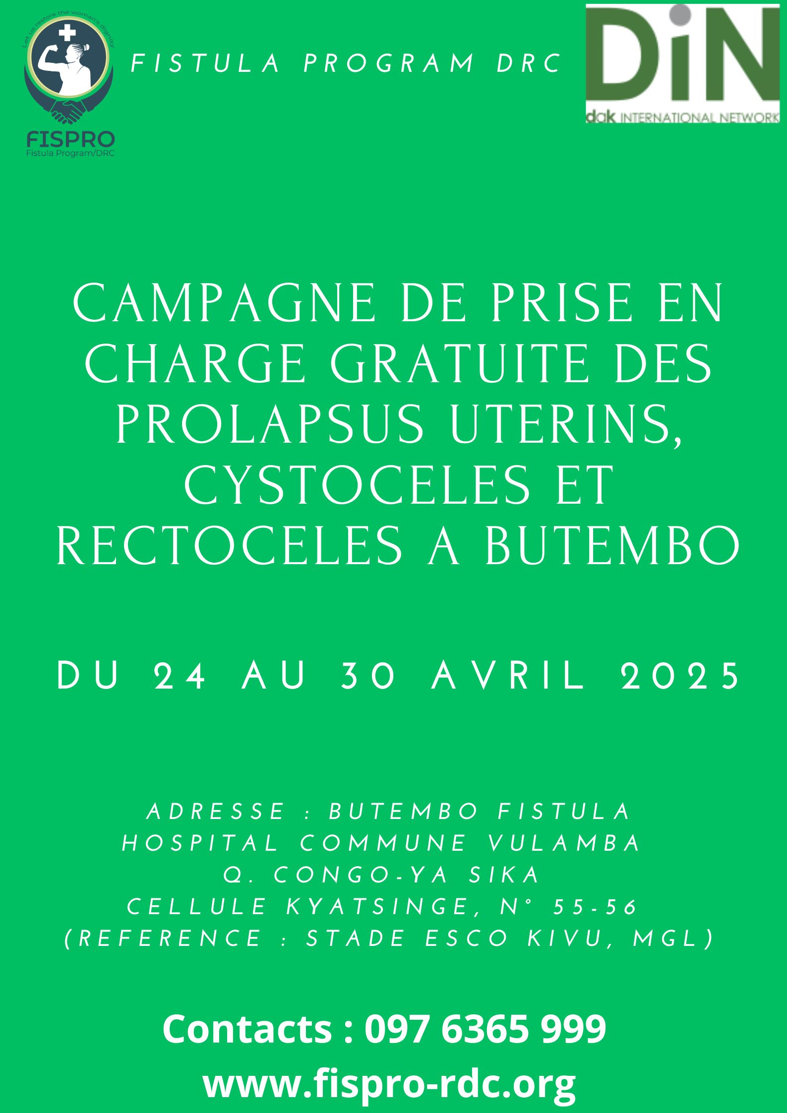 Avec l’appui de DAK International Network (DIN), FISTULA PROGRAM DRC (FISPRO DRC) organise une deuxième campagne de traitement gratuit des femmes ayant les problèmes des prolapsus utérins, cystocèles et rectocèles à Kinshasa et Butembo (Nord-Kivu).